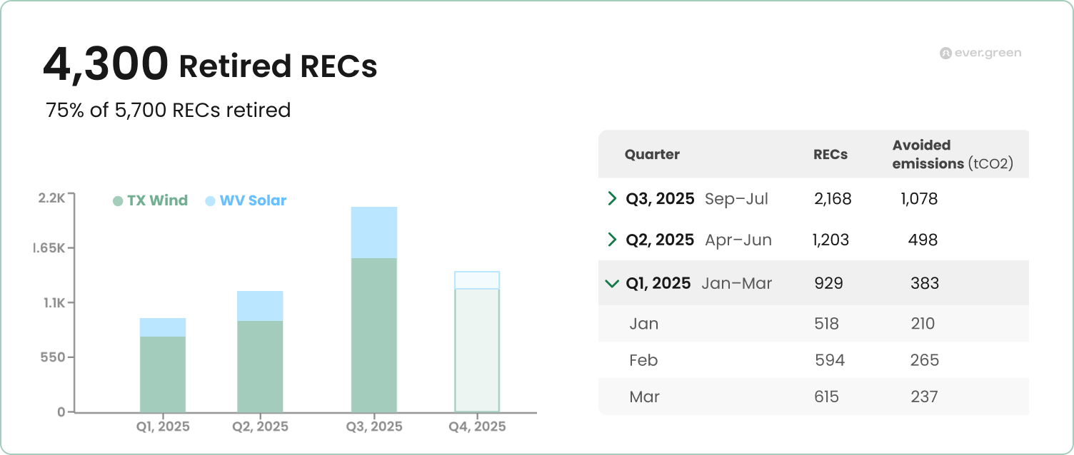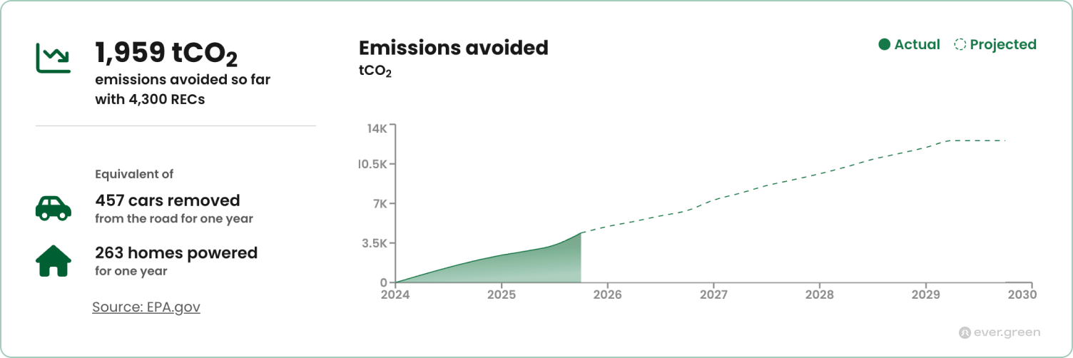 Ever.green’s updated platform tracks hourly REC generation and calculates tonnes of CO2 avoided for each REC. Our dashboard and improved REC Ledger aggregate this granular impact data for every watt-hour across your entire portfolio.