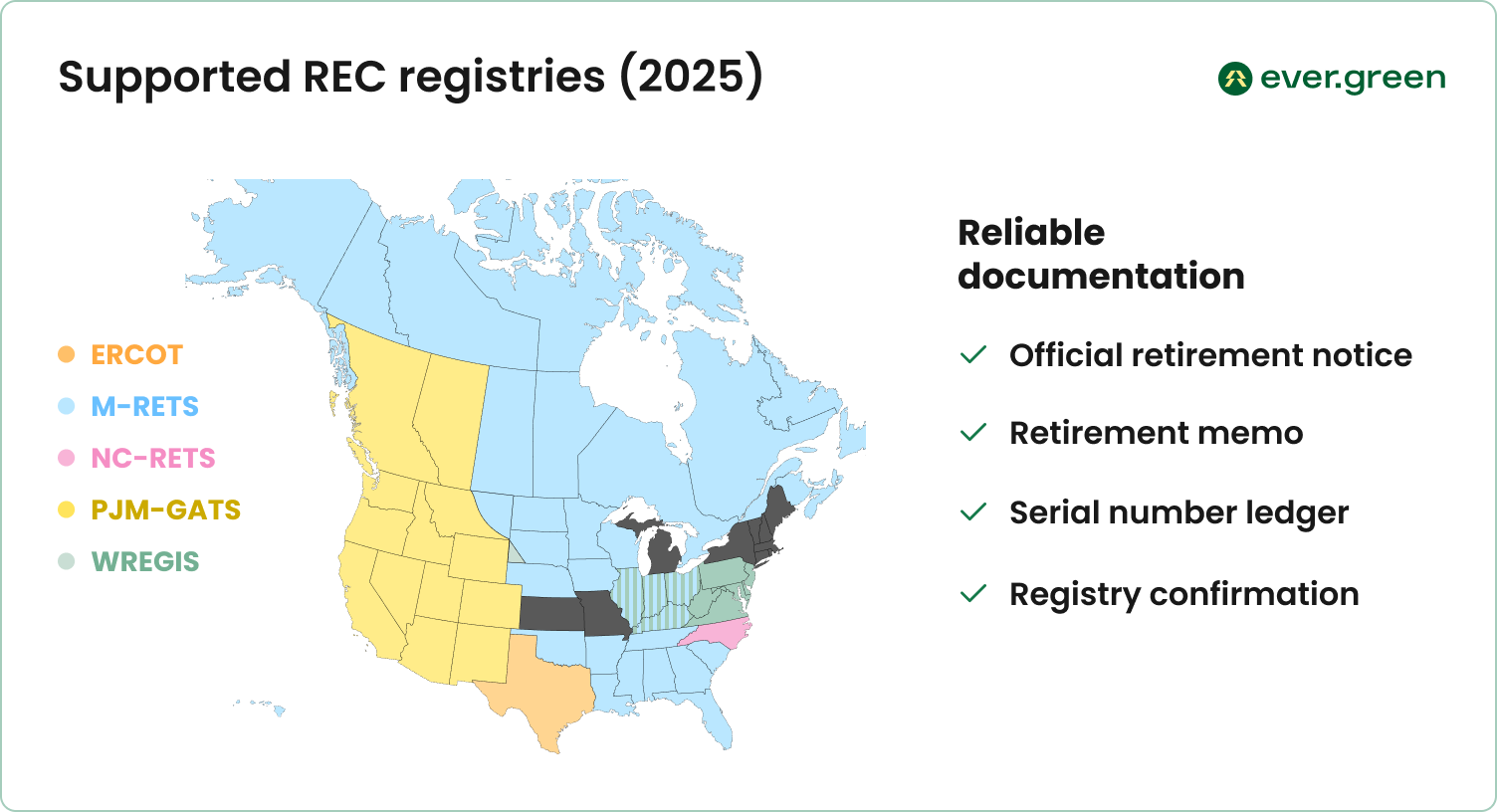 Ever.green continues to make High-impact RECs more accessible and more transparent. Our immediate focus is expanding registry coverage to handle retirements in additional tracking systems across the US and Canada. We are working to update our systems to handle the increasing complexity from potential new Scope 2 accounting standards, as well as widening the range of projects we support.
