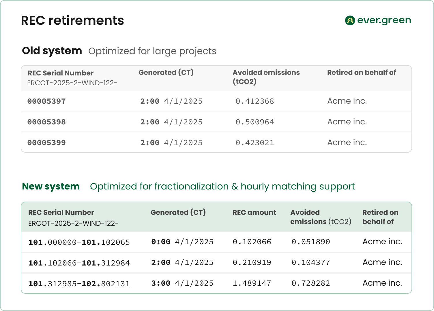 The reporting capabilities above are possible because of how we track and allocate RECs. Most REC tracking systems provide quarterly summaries with limited or no metadata. Ever.green takes a different approach.